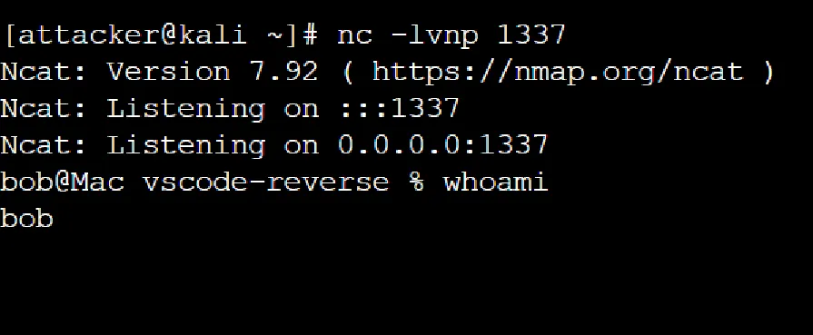 Et de son côté, l’attaquant voit un shell se connecter sur son port d’écoute :