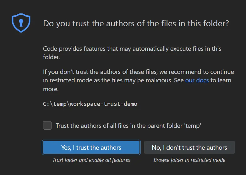 41% des développeurs utilisent VSCode et je pense que l’immense majorité a déjà rencontré ce message. Je pense également qu’une part non négligeable a cliqué sur “Yes, I trust the authors” sans trop réfléchir aux conséquences et sans même lire la totalité du texte.